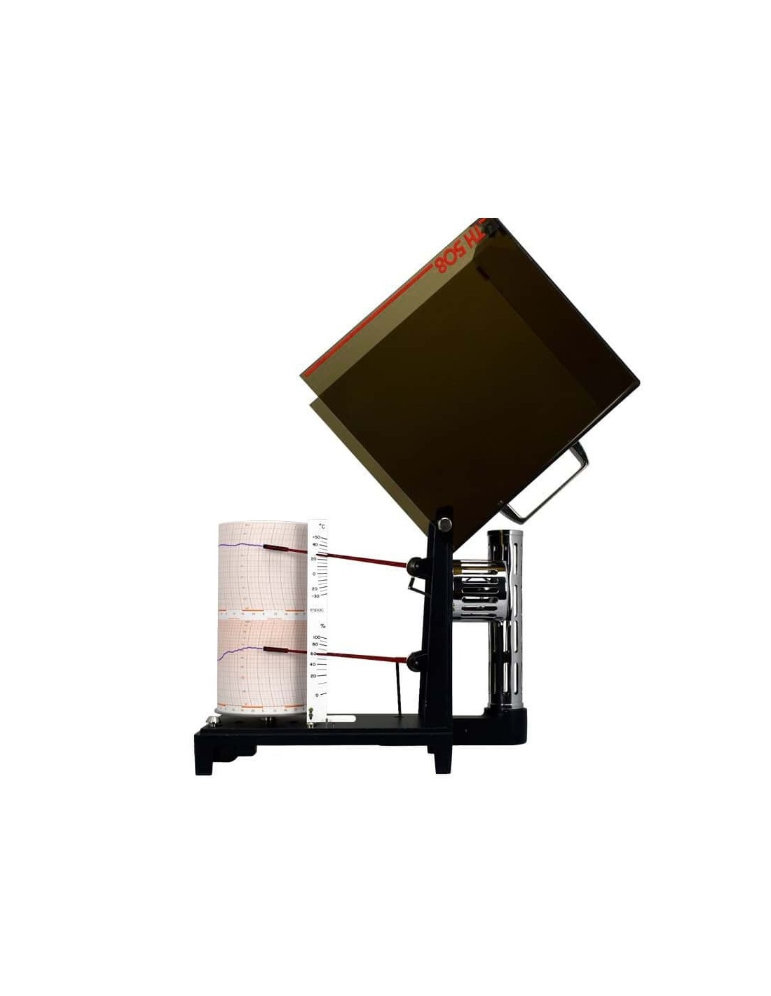O termohigrógrafo TH-508 possui relógio quartzo com três movimentos distintos e programáveis; Diário, semanal e mensal, totalmente encapsulado em tambor de polipropileno e cinta metálica cromada onde são fixadas as cartas gráficas. Sensores protegidos em gaiolas estampadas em latão e bronze totalmente cromadas.