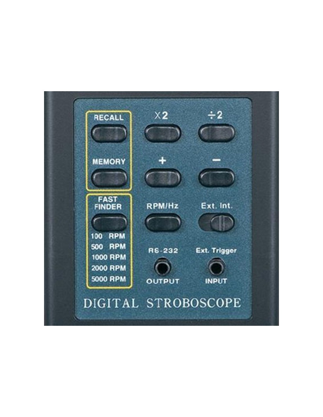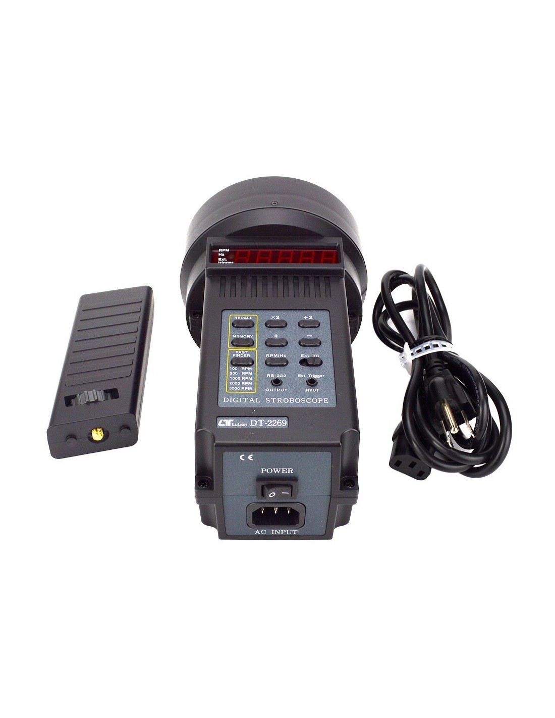 Este Estroboscópio Digital pode operar desde 0,3 até 175 lampejos por segundo, o que representa uma rotação desde 20 até 10500 rpm (Rotação por minuto) podendo ser visualizada instantaneamente através de seu mostrador digital tipo LED de 5 dígitos. O estroboscópio DT-2269 também pode armazenar até 10 configurações diferentes em sua memória, permitindo a fácil troca do local de medição sem a necessidade de novo ajuste.
