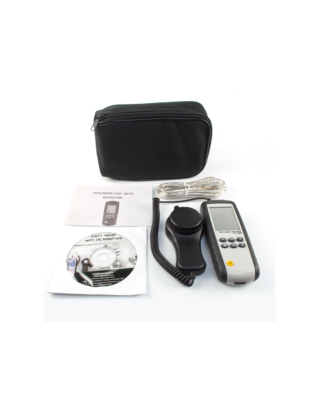 O Medidor de Fluxo Luminoso é fornecido pronto para a utilização com os seguintes acessórios: Bolsa para transporte e armazenamento, Manual de Instruções, pilhas, Software e Cabo USB.