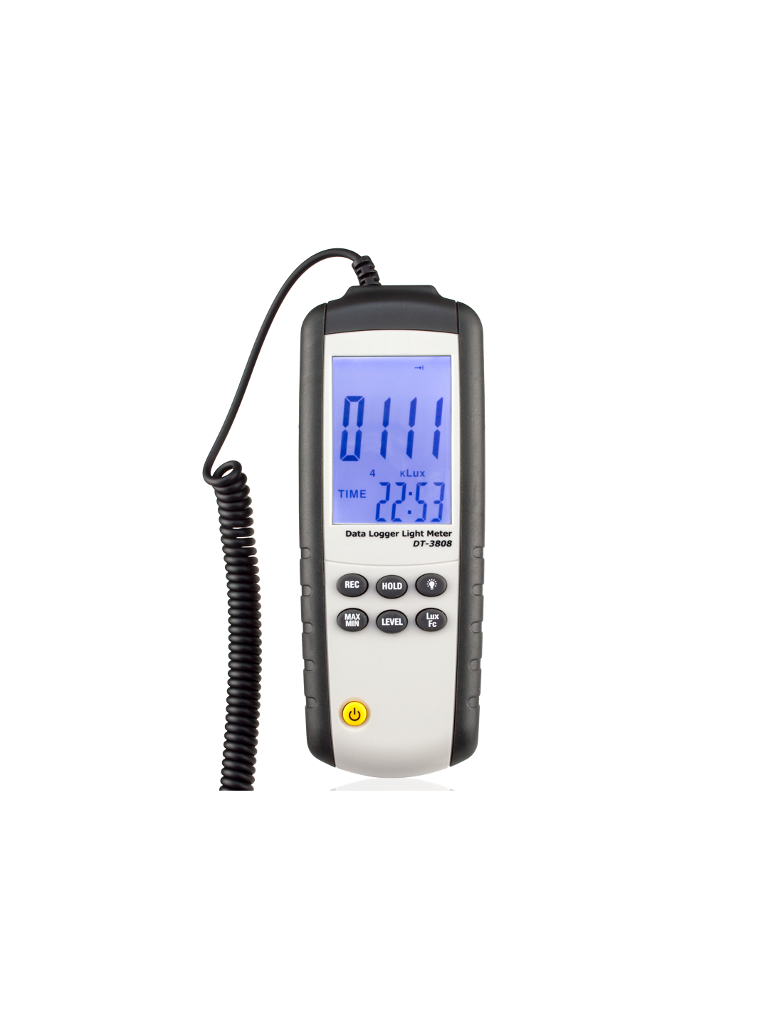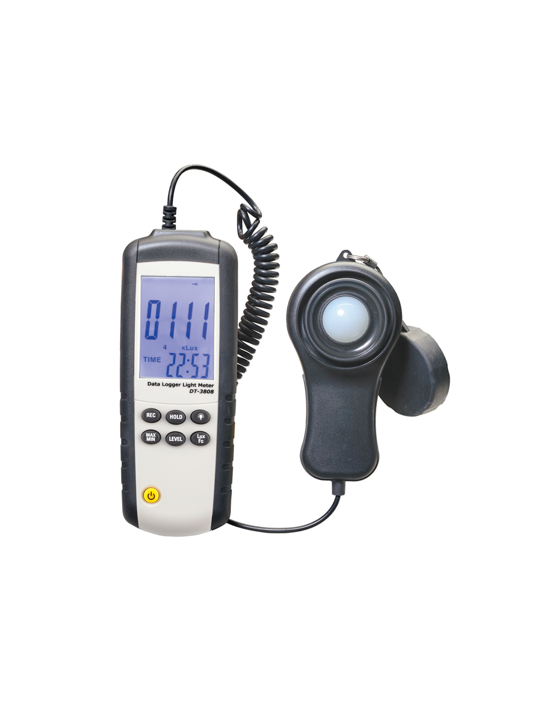 Luxímetro Datalogger 400.000 LUX DT-3808 é um instrumento de medição de fluxo luminoso por área, sendo igual a 1 lúmen por metro quadrado. Este luxímetro é construído com caixa ABS de alto impacto e laterais de plástico emborrachado. Possui 4 escalas de medição, 400 Lux, 4 KLux, 40 KLux, 400 KLux e seus equivalentes em Candelas.