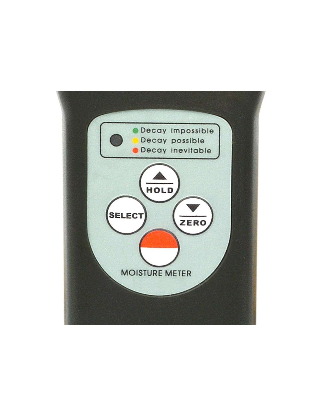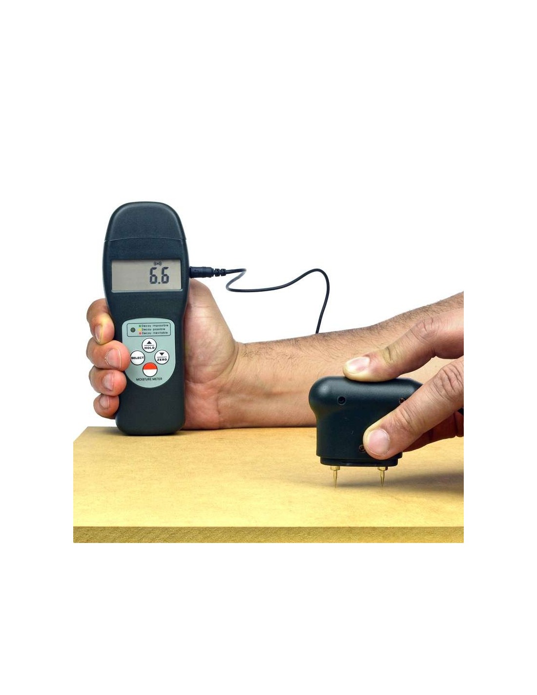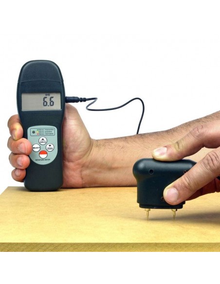 Medidor de umidade multifuncional, que permite medir a umidade de madeira, umidade de concreto e umidade de papel. Com o uso de sua tabela de calibração, permite a medição em até 150 tipos de madeiras diferentes, funciona com pinos de contato ou pelo método sem contato.
