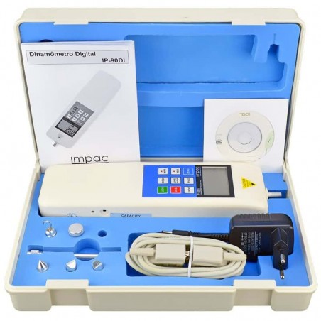 Estes Medidores de Força Digital Impac possuem célula de carga interna, bateria recarregável com carregador, adaptadores para a realização de ensaio de tração e compressão, mostrador retro iluminado alfanumérico com 6 dígitos, indicação do nível de bateria, inversor do mostrador, bips de alerta, interface com o computador e software (opcional) e prática maleta para armazenamento e transporte deste kit. Os Medidores de Força Digital IP-90DI Impac, quando adquiridas em conjunto com nossas máquinas de ensaio elétricas, eles conseguem através de uma programação no teclado desligar a máquina de acordo com a carga definida.