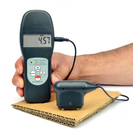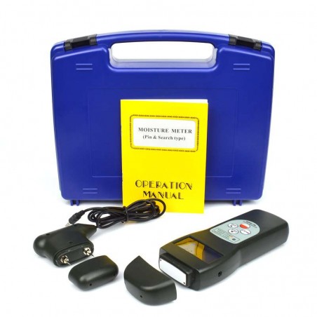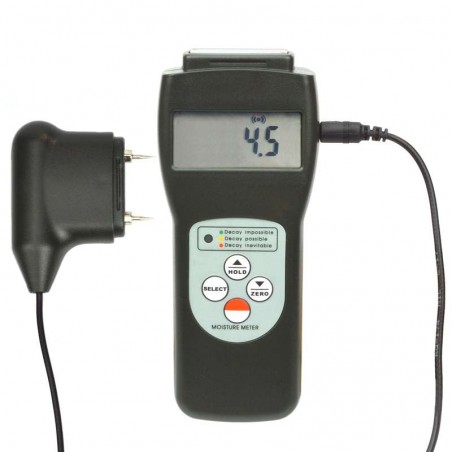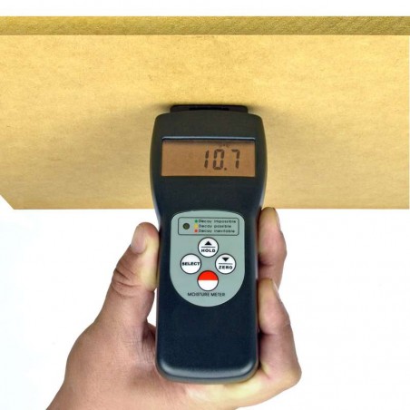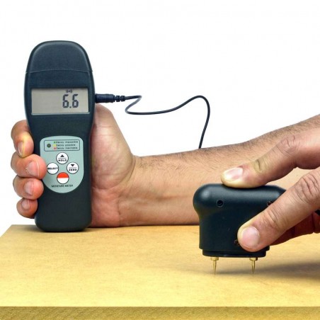 O Medidor de umidade de madeira, umidade de concreto e umidade de papel, é um medidor de umidade digital e portátil multifuncional, alimentado por bateria que dispõe de dois tipos de sensores, o de contato externo e o de aproximação incorporado ao instrumento.